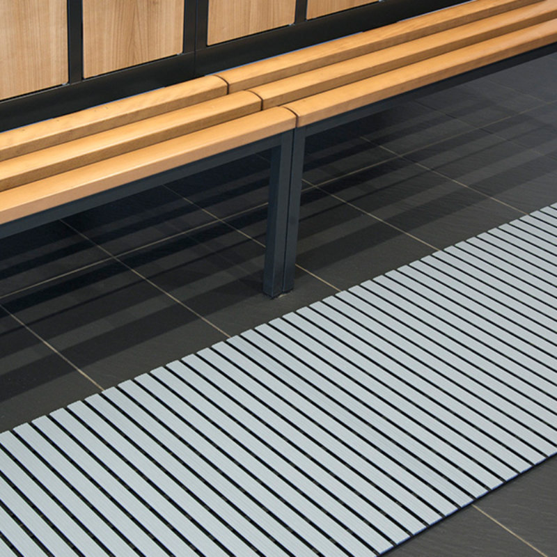 Der Baderost mit Profil aus Hart-PVC lässt sich besonders vielseitig einsetzen. Er bietet hygienische Bedingungen in allen Nassbereichen, in öffentlichen Duschen und Schwimmhallen, eignet sich gleichermaßen für trockene Bereiche wie Umkleidekabinen und Sozialräume. Auch an Arbeitsplätzen mit einem erhöhten Nässeaufkommen sorgt der Baderost für mehr Sicherheit und Komfort. Das Unterprofil besteht aus Weich-PVC, federt Erschütterungen angenehm ab, für ein bequemes Laufen und Stehen über den ganzen Tag hinweg.