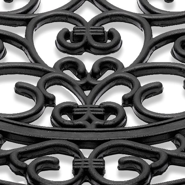 Eingangsmatten aus Gummi sind nahezu unverwüstlich und können bei jedem Wind und Wetter draußen liegen. Sie zeichnen sich durch eine hervorragende Abstreiffunktion für groben Schmutz aus. Dieser fällt nach unten durch und kann dann einfach weggekehrt werden. Das verschnörkelte Muster verleiht jedem Eingang eine edle Note.