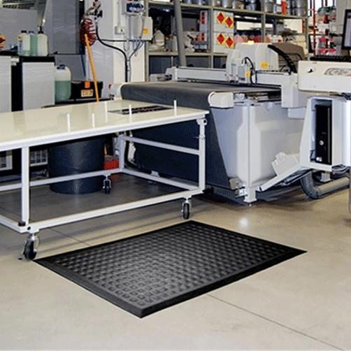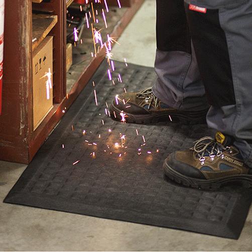 Antiermüdungsmatte aus Nitrilgummi, mit rutschhemmender Oberflächenstruktur, bei hoher Belastung – beständig gegen Öl/Fett sowie die meisten Chemikalien. Geeignet für Schweißerei-Arbeitsplätze