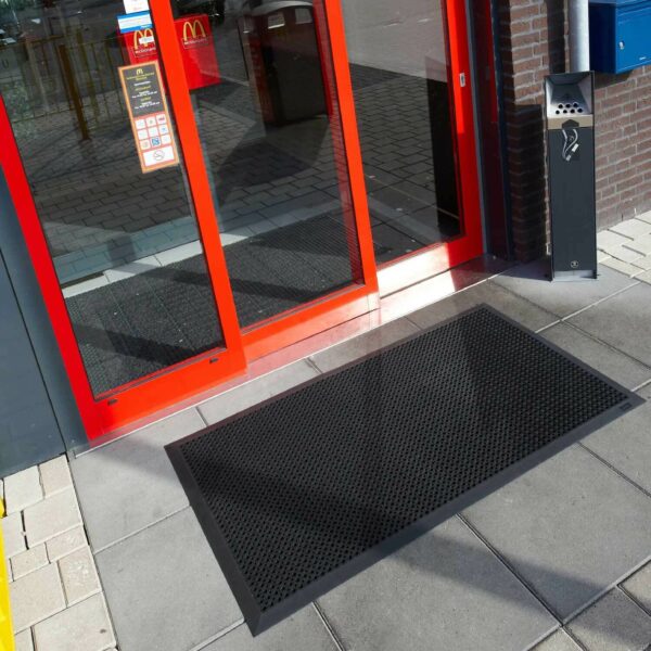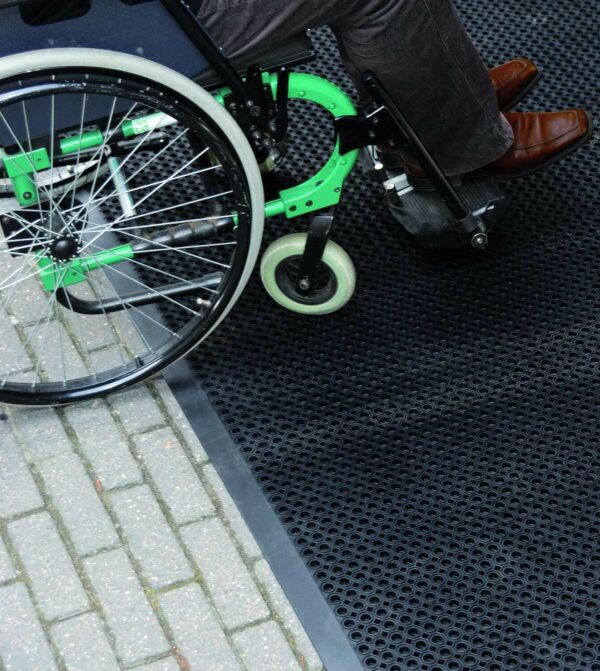 Die Ringgummimatte OCTO-BLACK ist unsere hochwertige Eingangsmatte für Außenbereiche mit hoher Belastung. Abgeschrägte Kanten und die extra kleinen Waben machen ein Befahren mit Rollstühlen, Einkaufswagen oder Karren möglich. Hervorragende Gummimischung macht die Matte zu einer langlebigen, unempfindlichen Eingangsmatte für Außen. Feuchtigkeit und Schmutz kann durch die Löcher schnell abfließen und es entsteht ein sehr guter Drainage-Effekt.