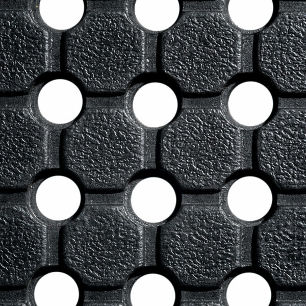 Die Ringmatte zeichnet sich durch ihre gute Rutschhemmung und Beständigkeit aus. Durch die Gitterstruktur entsteht eine Feuchtigkeits-ableitende Fläche. Durch die Löcher können Flüssigkeiten schnell abfließen und es entsteht ein Drainage-Effekt über die Fläche.